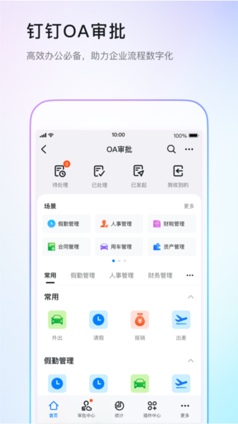 【一站式人事OA应用】提供考勤、签到、审批、日志、公告、请假、报销、出差等OA功能,同时支持企业自定义应用接入,全面实现智能移动办公。