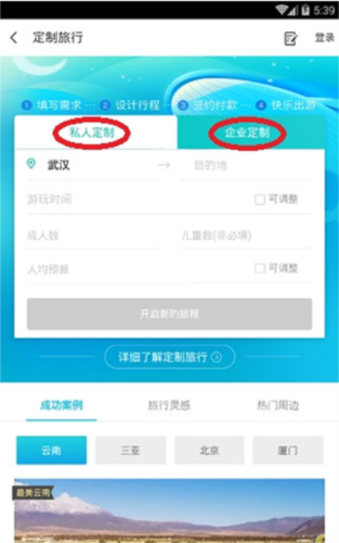 2、支持私人订制以及企业定制,用户可以根据出行需求选择,填写相关资料即可