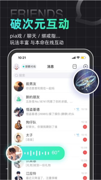 名人朋友圈是一款以文字COSPLAY为基础的手机聊天软件,本软件采用了以角色扮演为主题的聊天模式,在这里,你可以随时切换自己的角色,与他人进行匿名聊天。我们通过角色扮演,要学会把自己融入角色,用角色的脾性语气说话。总之名人朋友圈跟其他所有社交都不一样,这里不分性别不分年龄,不管现实生活中的你是怎样的,在这里都可以找到你想成为的那个自己。对了,玩名人朋友圈真的可以提升语文水平哦,这是使用过名人朋友圈app的用户们共同的体验。以文会友,体验众创文学的全新写作方式,文字写作能力不知不觉得到了提升。