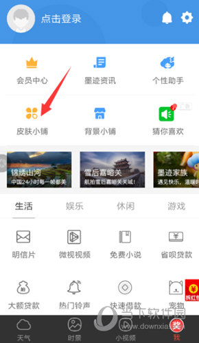 2、确认之后我们就可以打开墨迹天气手机版的“个人中心”界面,在该界面选择“皮肤小铺”。