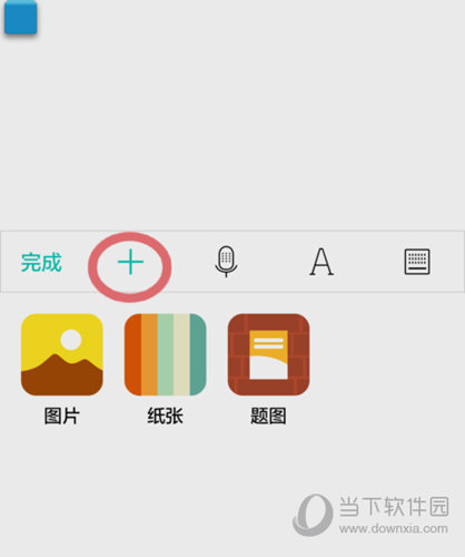2、这就是新建的文档了,点击“+”号,可以选择“图片”(插入的图片)、“纸张”(背景图片)、题图(查看文章时的封面图片)。而“话筒”符号,即表示接受语音输入以提高便捷度。