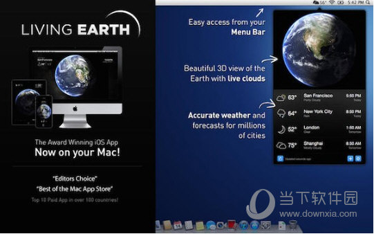Living Earth是Mac os平台上的一款可以帮助用户了解实时天气的电脑软件,该软件拥有与众不同的界面,带来十分绚丽的世界时钟和天气功能,它以3D时钟的形式实时显示世界天气,支持卫星云图。