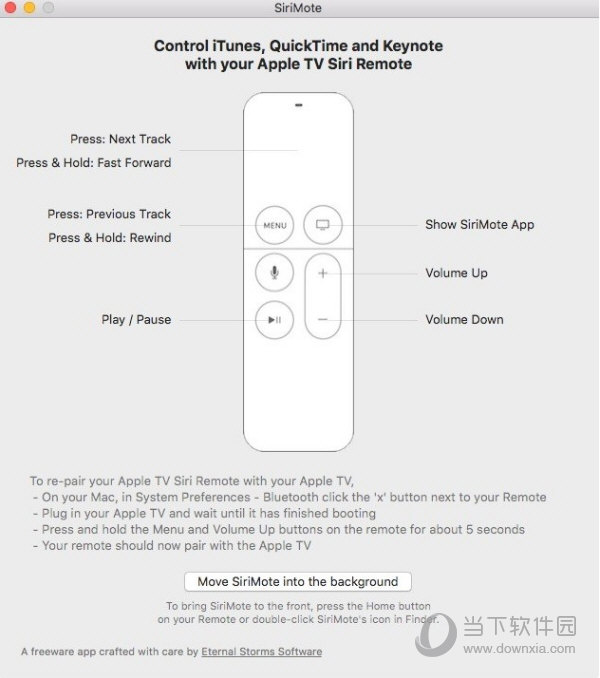 请注意,你的苹果电视必须关闭并拔掉电源。要再次使用Apple TV的遥控器,首先必须从与Mac配对的蓝牙设备列表中删除该设备,然后再次与Apple TV进行配对过程。SiriMote的设计目的是将从苹果电视Siri遥控器接收到的命令转换成键盘事件。因此,您可以使用它来控制任何带有媒体键支持的macOS应用程序,如iTunes、Keynote、QuickTime Player、VLC Player等。此外,您还可以调整系统的音量。