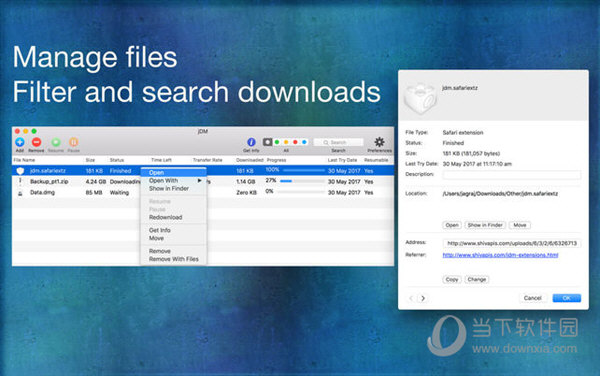 复制/粘贴、拖放添加下载,直接从jDM打开文件或从jDM拖放文件,在Finder中显示,重新下载,提前知道下载是否支持resume。