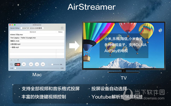 无线投屏大师Mac版是苹果电脑上的DLNA投屏软件,支持小米电视,乐视电视,海信电视,小米盒子,天猫盒子等各种电视盒子的投屏,投屏设备自动选择,操作也非常简单,有需要的可以下载来使用。