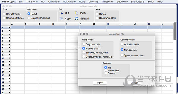过去的用户界面由一个窗口表示,您可以在其中可视化导入的数据。注意,Past可以从文本文件中提取信息,您可以决定如何组织它。此外,Past还允许您删除包含不相关信息的行或列、添加新信息或简单地重新组织信息。通过该应用的顶部工具栏,您可以选择查看行或列属性、更改选择模式、激活band函数并更好地查看行等等。