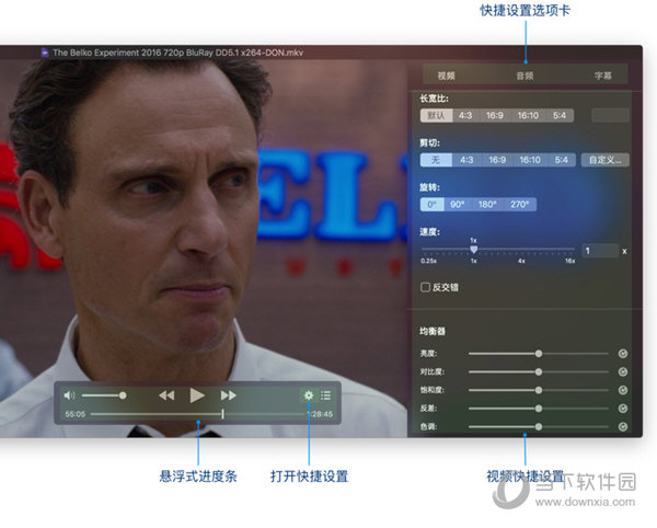 IINA 对常见的音视频设置提供了快捷入口,点击悬浮式进度条右侧的齿轮可以快速打开便捷设置。根据 macOS 系统的支持,IINA 的毛玻璃特效的进度条和标题栏有四种不同的主题可选:Dark、Ultra Dark、Light 和 Medium Light。