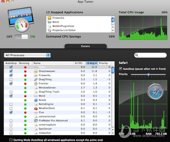 App Tamer是一款适用于Mac的检测电池软件,它可以帮助用户随时检测暂停常驻程序、延长电池续航力,对于当前电量不足的用户可以使用。
