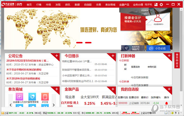 方正证券小方Mac版包括行情交易、泉友商城、金融产品、市场全景、发现事件、资讯频道、一键打新、实时分析及数据解读等功能。