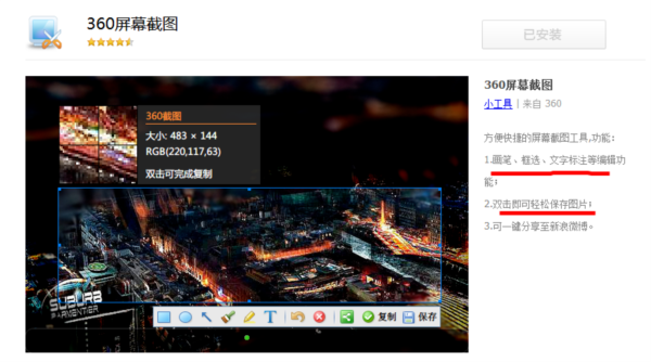 3、接下来进入到小工具界面,在这里我们根据提示找到“360屏幕截图”然后选择【安装】按钮即可自动安装。如不太了解该工具,你可点进“360屏幕截图”选择性阅读文字介绍。