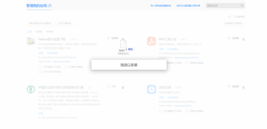 第三步:开启开发者模式将插件文件拖入拓展中心确认安装