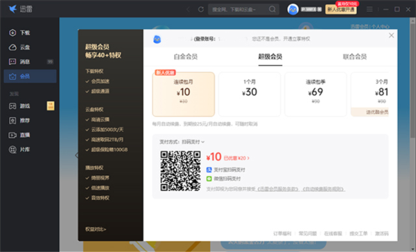 3、然后,在会员开通界面选择好会员种类(白金会员不提供加速、超级会员最有用、联合会员)、选择好开通时间后就可以扫码付款了;
