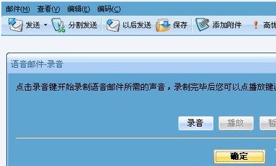 在写信窗口工作栏中有一个语音邮件按钮(如图8所示),点击此按钮弹出语音邮件对话框,在对话框中可以点击录音开始录音,录音完成后,还可以通过播放先试听一边。如果没有问题则可点确定按钮,将会以附件的形式进行发送。这样当你的朋友收到该邮件后,便会自动播放你录制的语音文件了。