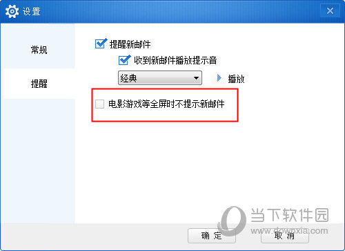 在设置里面【提醒】一栏中勾选【电影游戏等全屏时不提示新邮件】