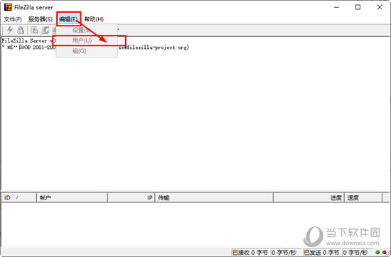 1、首先进入到FileZilla Server中文版之中,在顶端菜单栏中点击“编辑”然后选择“用户”;