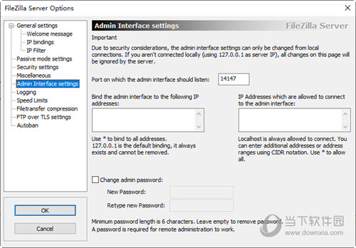 注意:修改端口和密码非常重要,这是确保Filezilla安全的重点,必须修改端口,必须设置密码!密码建议足够复杂!可以在管理界面中进行修改