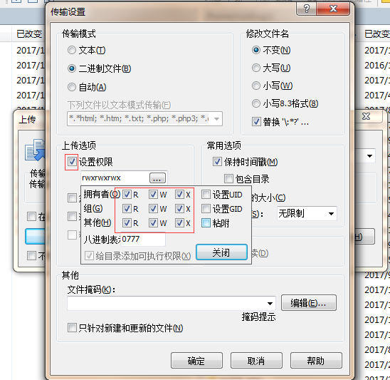 上传文件,在左边选定要上传文件所在的目录,选中文件右击上传,可以设置文件在远程服务器里的权限.