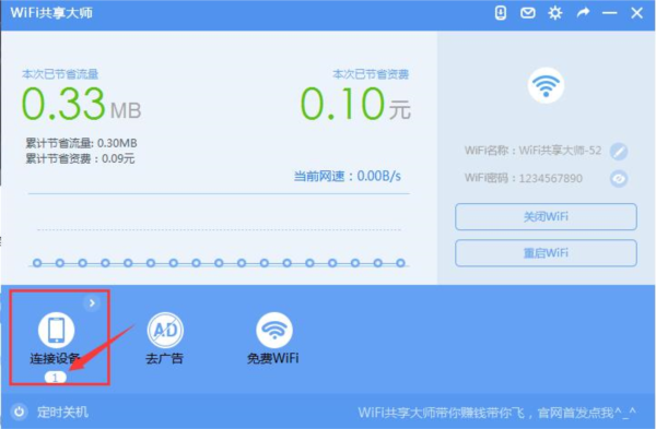 3、在电脑端创建好WIFI后,显示连接成功。此时,你就可以打开手机上wifi按钮或笔记本的WIFI,在WIFI选项中找到你刚才设置的WIFI名称,点击打开输入密码。成功连接上之后手机或笔记本会有相应提示,已连接。同时wifi共享大师也会出现提示,有*台设备已连接上。(连接设备会显示当前所连接的设备数目)。连接成功后在界面还会显示当前网速,计算节省流量和节省自费等信息。