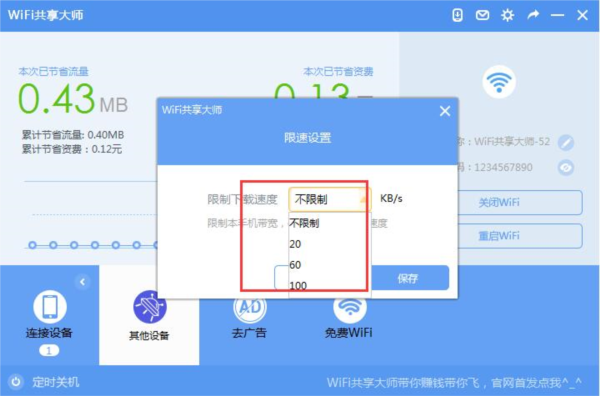 限速:在其他设备小工具中用鼠标滑动在下方我们可以看到一个锁的图标,点击打开我们就可以对连接设备进行限速设置了,在这里为用户提供不限制、20KB/s、60KB/s、100KB/s等四种选项。大家根据连接设备的数目可自定义选择带宽,选择完成后点击保存就可以了。 这样就完成了对连接设备的带宽设置。