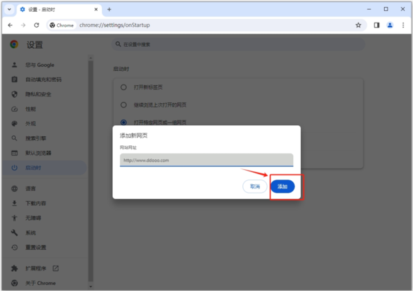 2、在设置页面点击“启动时”——“打开特定网页或者一组网页”——“添加新网页”;