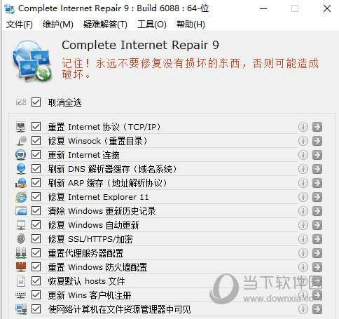 Complete Internet Repair9是一款小巧易用的网络修复软件。下载后直接运行 ComIntRep.exe,勾选掉需要修复的选项,然后点击开始,直接进行修复。同时也要提醒大家的是,没有问题的功能不要尝试修复以免修复出问题了。工具不是万能的,如果真的尝试使用工具依然无法修复网络问题,最坏的打算就是重装系统了。