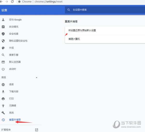 点击左边栏左下角的“重置并清理”,在弹出的右边栏点击“将设置还原为原始默认设置”如下图: