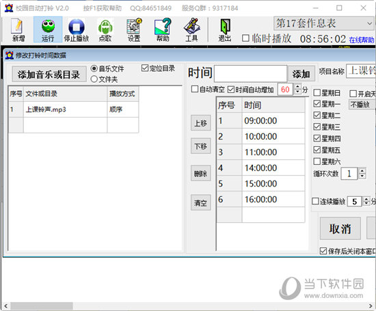 校园自动打铃系统是一款专业免费的智能自动打铃软件,主要为学校、工厂、公司等单位和部门打造,只要一台电脑和一个功放机、若干个喇叭或音箱就可以完成自动广播打铃。本软件以方便、灵活、节能、人性为主要特点。本软件操作界面直观、步骤清晰,可以创建任意多套方案。
