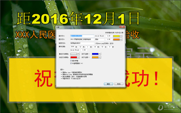 大屏幕事件倒计时是一款非常实用的倒计时软件,适用于高考、重大比赛、考研等倒计时,支持替换bg.jpg,可更换背景图片、替换done.png,更换倒计时结束后的祝贺画面,倒计时画面,可按F1,查看操作说明,其中带星号标示下次执行有效,软件体积小,用户界面非常人性化,操作便捷。