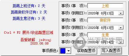 第1次运行时,3个事项均为空,可以按需要自行依次(比如不要只填1和3)填入事项内容、选择需要的日期,点击“写入配置项”。