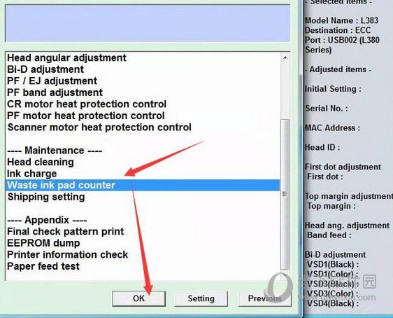 4、选中废墨计数器清零Waste ink pad countedr ,然后点击OK进入清零;