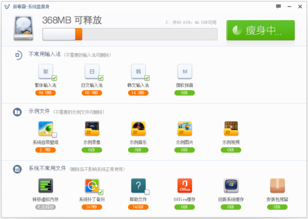 随着电脑使用的时间越来越长,很多用户由于不注意使用电脑的习惯,C盘的空间也会越来越“臃肿”;而作为系统盘的C盘,空间不足时,也会大大拖慢电脑系统的运行速度。新毒霸系统盘瘦身是一款方便易用的系统盘瘦身软件。该软件是一个独立版可直接打开不需要安装新毒霸,可以帮助用户来一键清理系统盘垃圾。