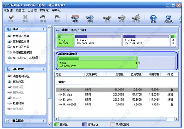 2、这步的目标是缩小C盘,请选中C盘并移动鼠标到“分区快速调整区”的最右端,然后当鼠标指针变成双向箭头时,点击圆形的手柄并向左拖动鼠标来缩小这个分区到40GB,如下图2所示:(您也可以右击C盘选择“调整/移动分区”选项来缩小C分区)