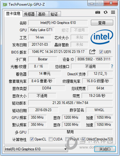 首先我们下载安装gpu-z中文版,打开软件以后我们可以直接看到显卡的各项详细参数
