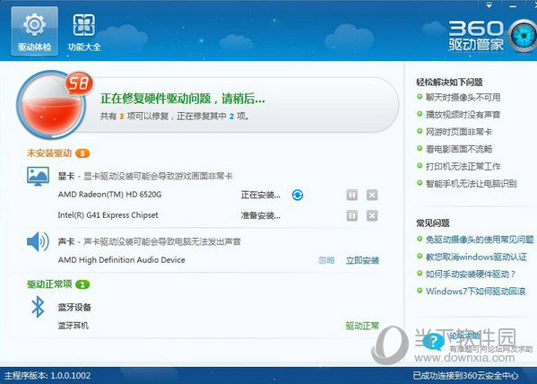 1、首先需要下载安装360驱动大师,安装完毕后打开后,360驱动大师会自动检测你的系统驱动情况,如下图所示: