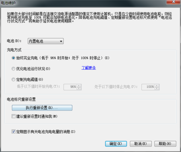 在“电池维护”选项卡中,“执行重新设置”按钮是对电池标尺重新设置,跟随软件相应的提示,经过几次确认后即可开始对电池进行电池容量重置过程。