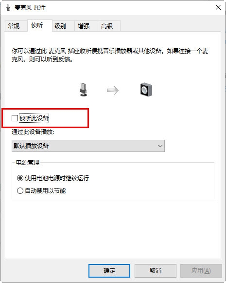 在“麦克风属性”中,切换到“侦听”选项卡,把“侦听此设备”前面的勾去掉;