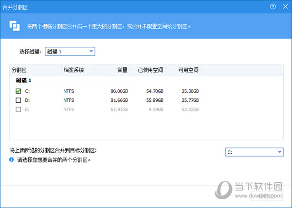 在不丢失数据的情况下合并相邻的分区为一个更大的分区,或合并非邻近的未分配空间到一个分区。