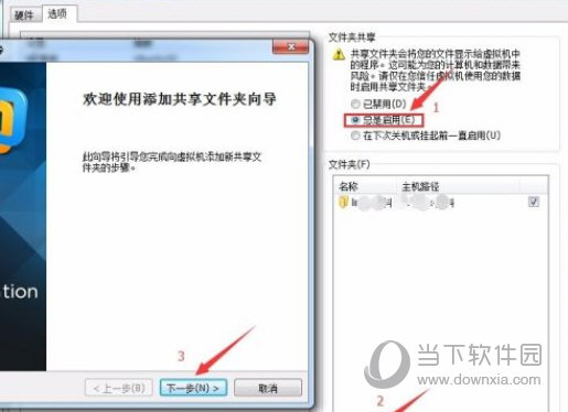 之后,右边切换到“文件夹共享”页面,点击“总是启用”或者“在下次关机或挂起前一直启用”,之后,点击页面中的“添加”按钮。