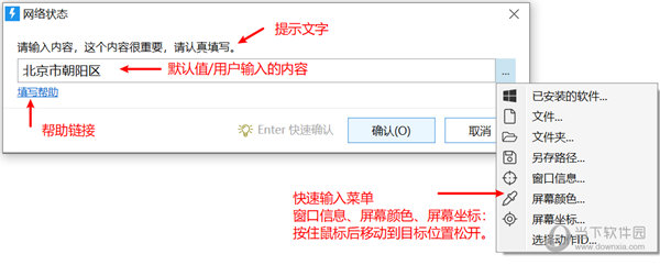 【帮助链接】显示在输入框下方的连接网址。格式为"显示文字|网址链接",如“表单填明|https://getquicker.net”
