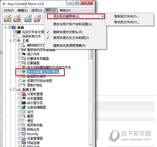 2、依次点击额外—添加到右键菜单,拖拽所需要的程序到其上面。