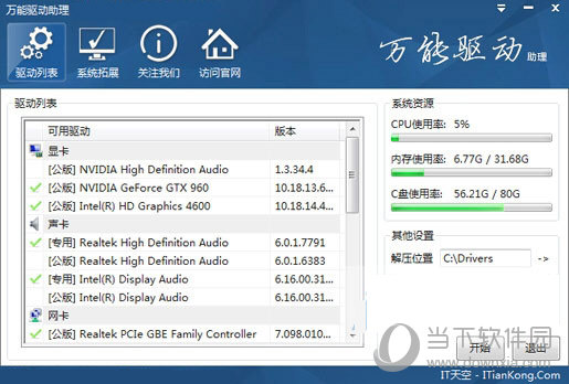 【万能驱动助理】硬件设备支持:万能驱动助理 搭载了经过 IT天空开发团队精心整理制作的驱动包。这是到目前为止,我们针对当前主流硬件设备收集和整理得最全面的驱动文件集合,支持市面上的绝大多数的硬件设备(且兼容多数以往的老硬件)。驱动包经过合理定制和整合,是市面上所见到的体积相近的驱动套装中支持最多硬件设备的。