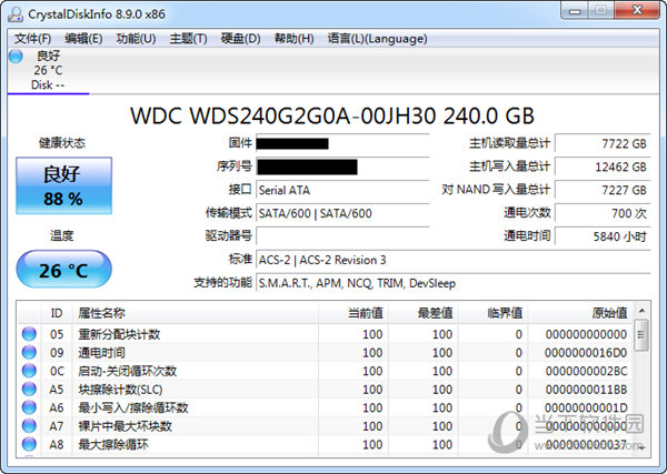 在下方你可以看到硬盘的各项数据,并显示出当前值、最差值以及临界值等,可以快速的对比出硬盘的健康状况。