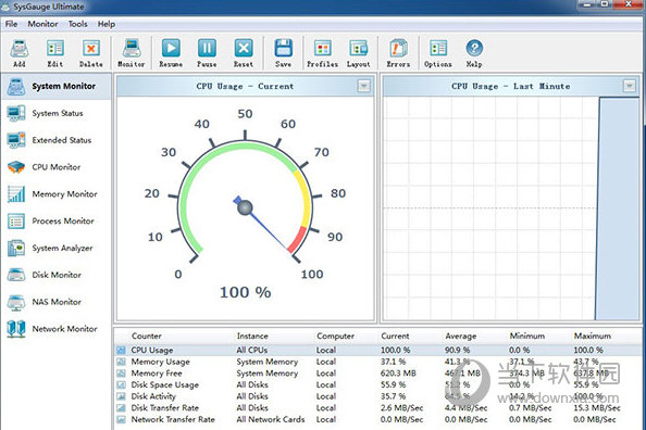 SysGauge是一款功能强大的系统性能监控软件,能够帮助用户实时检测自己的系统参数、包括CPU使用率、内存使用率、网络传输速率等,全方位检测系统性能。软件已经成功破解,去除了各种功能限制,用户可以无限制的免费使用软件的全部功能。