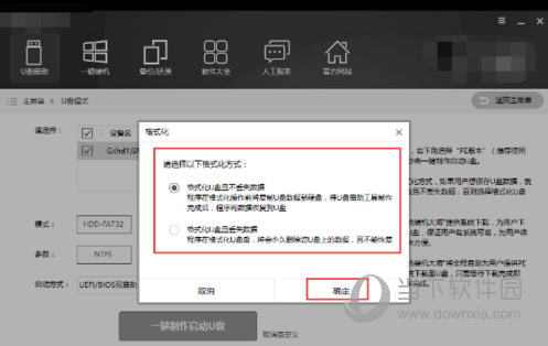 4、在接着会弹出格式化的窗口,建议选择格式化u盘且不丢失数据,这样在制作U盘时就不会格式化U盘里面的资料了。