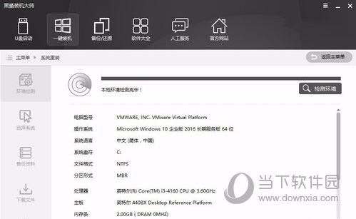 2、点击系统重装后,黑鲨装机大师自动进行环境检测,显示电脑配置。并推荐合适的安装系统。检测环境完成后,点击“下一步”。