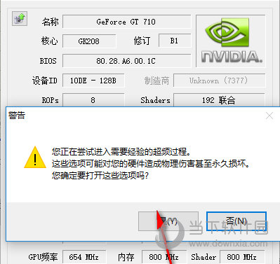 2、接着将会弹出一个警告框,将会提示你将要进入超频选项,因为有些显卡不支持超频,所以这里会有个提示,可以忽略它,这里默认选择 “是” 按钮
