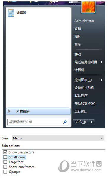 3、皮肤包含多种系统的经典样式,还可以设置开始菜单是否透明,是否使用小图标等。