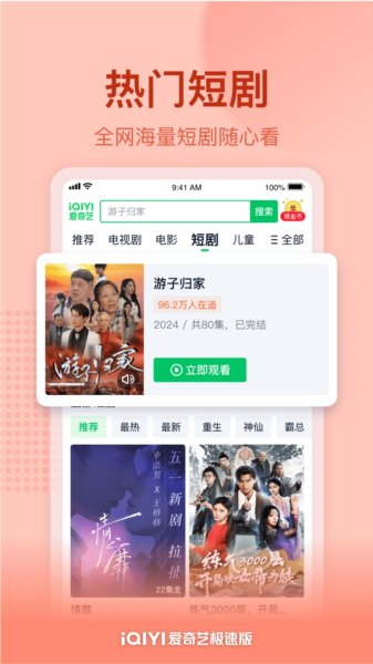 爱奇艺极速版是爱奇艺公司出品的一款精简的个性化推荐APP在这里,你可以享受极速的视频服务,包小可极速安装,省内存,不卡顿,速度快,界面简洁,体验流畅,搜索结果更清晰。在这里,你可以获取想看的视频,娱乐八卦、趣味视频、热点资讯、生活小常识……覆盖全网热门短视频和长视频,好看到停不下来!