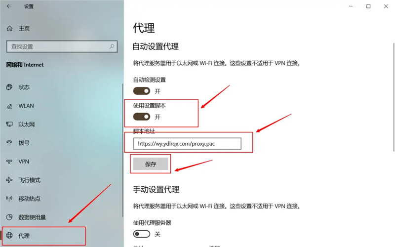 在windows设置中,选择网络与internet,然后在代理页面打开“使用设置脚本”,输入脚本地址:https://wy.ydlrqx.com/proxy.pac