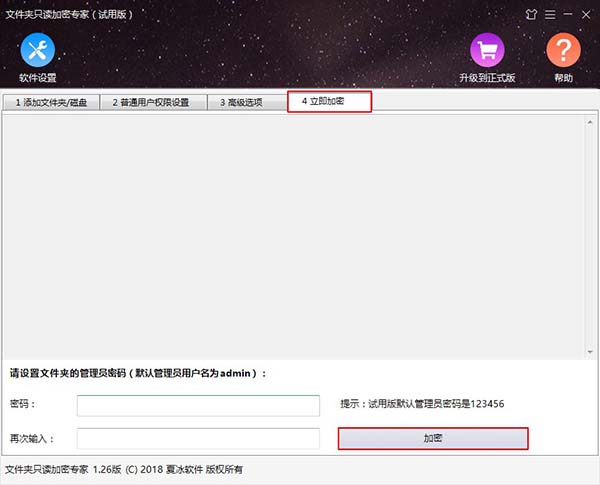 1. 点击软件窗口上方的【立即加密】,在软件窗口下方的管理员密码输入框中,输入管理员密码。(请注意:试用版软件的默认管理员密码是123456,无法修改。)